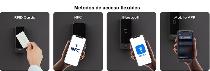 • Métodos de entrada de puerta: Tarjetas RFID, NFC, Bluetooth, APP